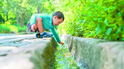 ”香山公园管理处宣传科科长绪银平带着记者走进了香山公园景区,向南麓方向前往双清别墅的主干道旁,有一条浅浅的石质水槽,水槽呈U形,宽约60-70厘米,清澈的水如小溪般在槽中缓缓流淌,顺着地势朝山下流去。”林毅说,为了恢复古水系原貌,香山公园到原产地寻找相同石材,同时邀请非遗传人指导,学习古代工匠所运用的“打道”“砸花锤”“剁斧”等加工手法,在石料表面形成深浅相间的纹路,修旧如旧。另一路至见心斋——宗镜大昭之庙前方河——致远斋——勤政殿南山石上形成瀑布流入下池——勤政殿前月牙河——出园流入东宫门外方河。